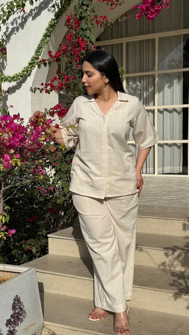 Elevate your professional look to the next level with our Beige Cotton Pintex Co-ord. Featuring a stylish pintex design on the shirt, this co-ord also includes convenient pockets on both sides of the bottom. Made with a classic collar shirt, it's the perfect choice for any party or work event.