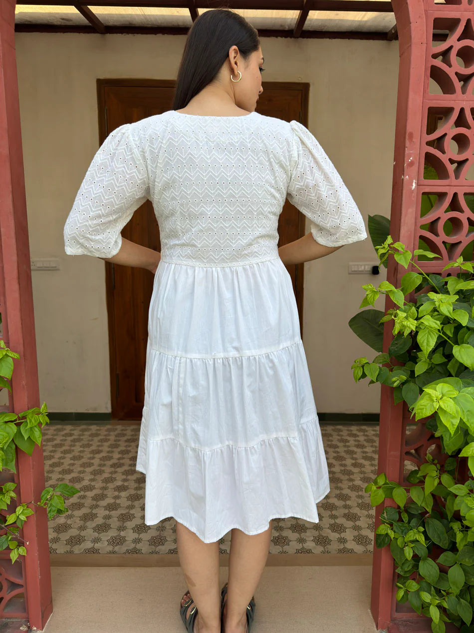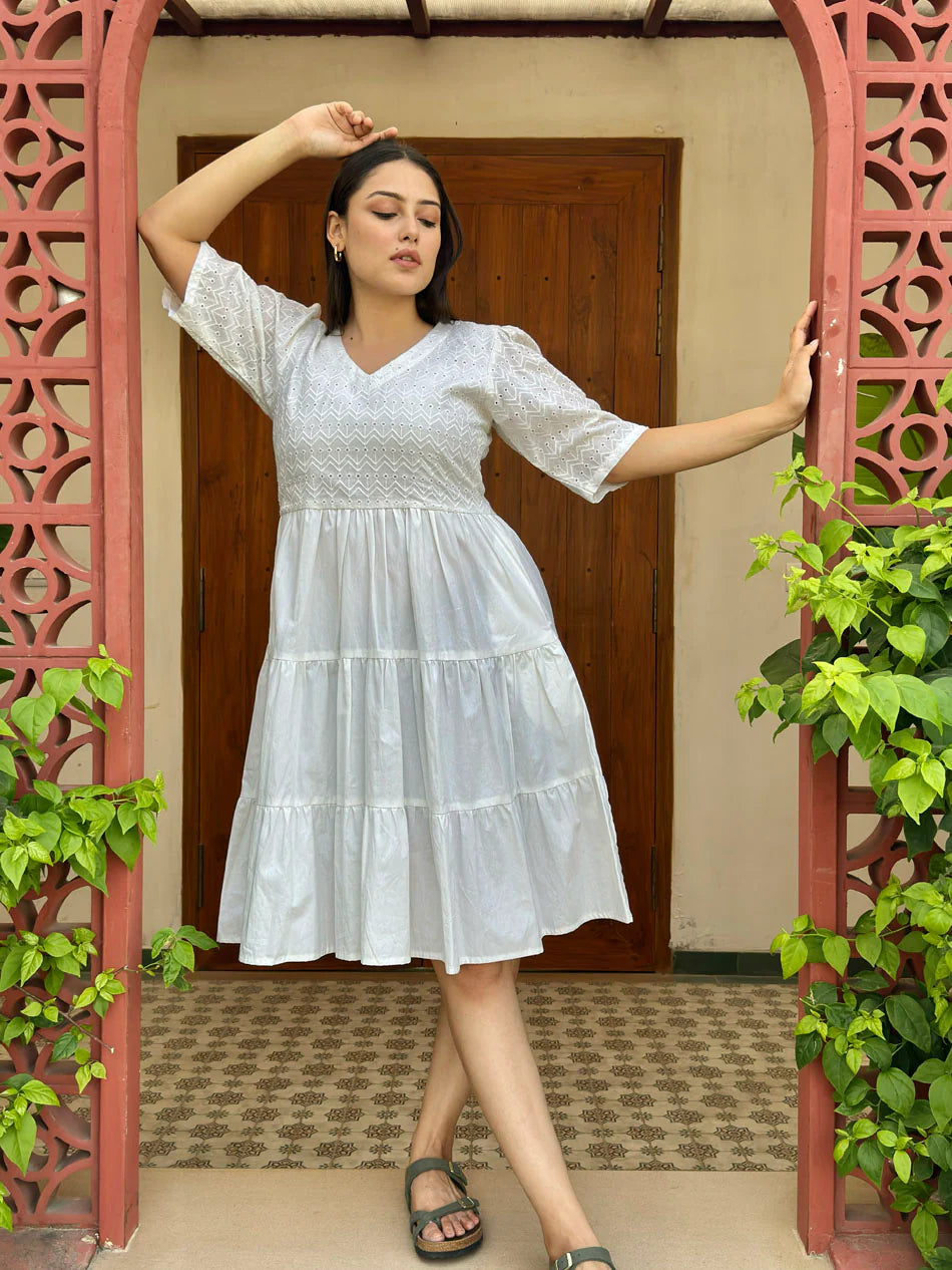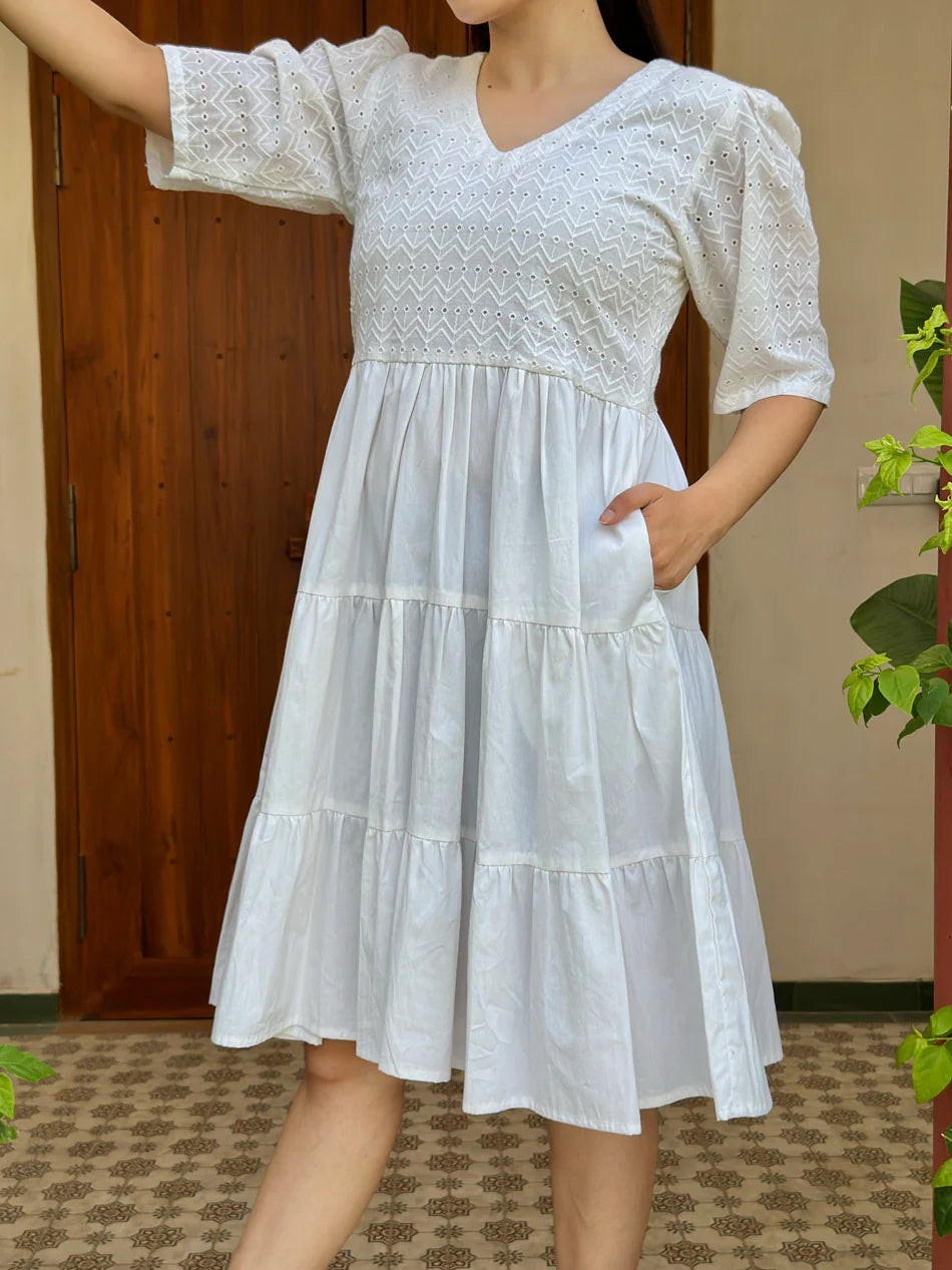 Elevate your style with the Cotton fabric Bella White Schiffli Dress! Its schiffli fabric bodice, three layers gather, and comfortable lining make it perfect for brunch, vacation, or day to night parties. Pair with heels or shoes for a chic look and complete it with a stylish tote bag.