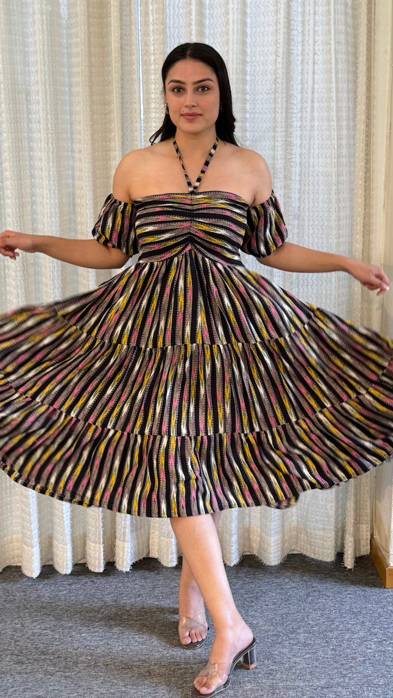 This black midi dress features a stunning multi-strip color pattern and off-shoulder sleeves. Its flared fit and stretchable elastic in the back make it both comfortable and flattering. Perfect for any occasion, this dress is sure to turn heads with its unique design.