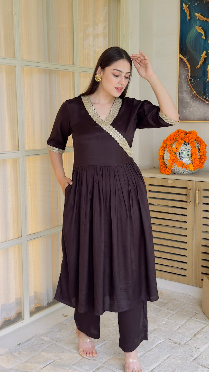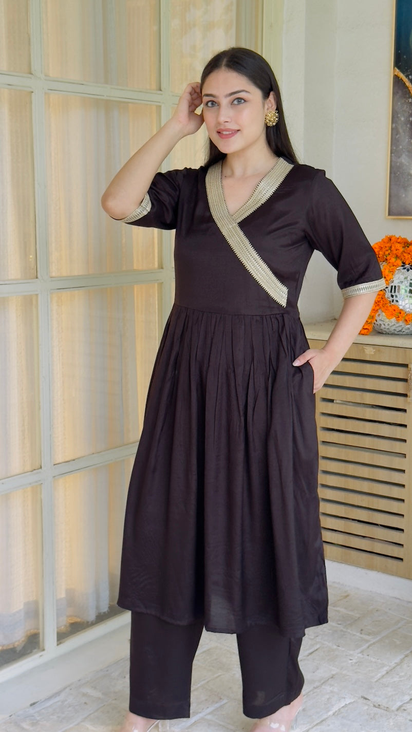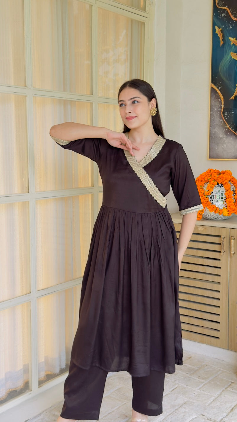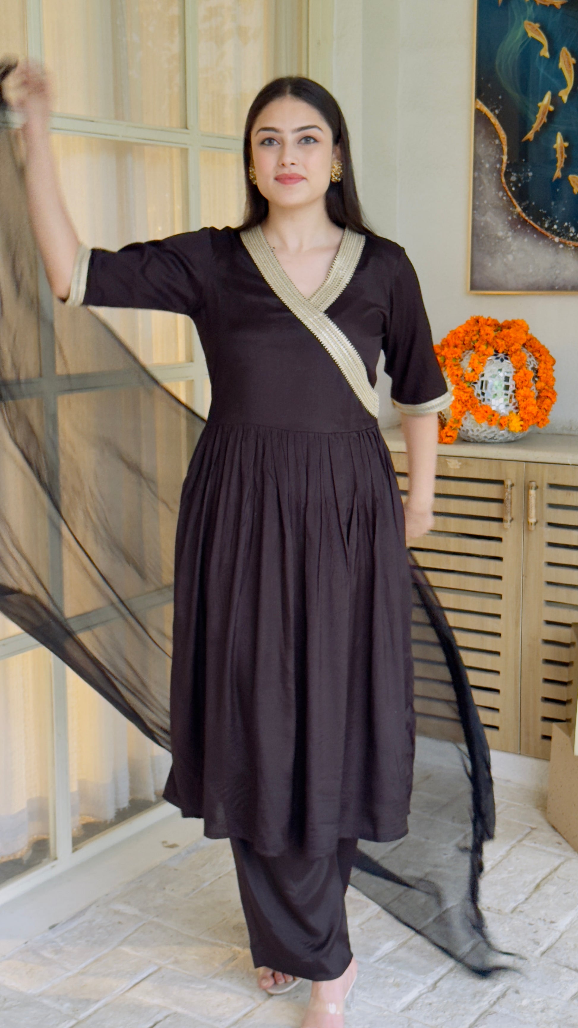 The Diya Suit Set features a three-piece ensemble including a kurta, pant, and dupatta crafted from soft cotton silk fabric. Its elegant black color is enhanced by golden lace detailing, creating a refined look that stands out in festive and wedding gatherings. Designed for comfort and style, this set is an excellent choice for special occasions during the festival season. Dry Clean or Hand Wash with Mild Detergent.