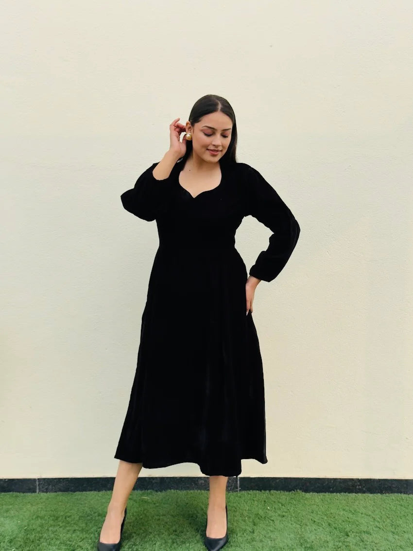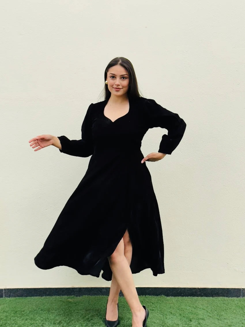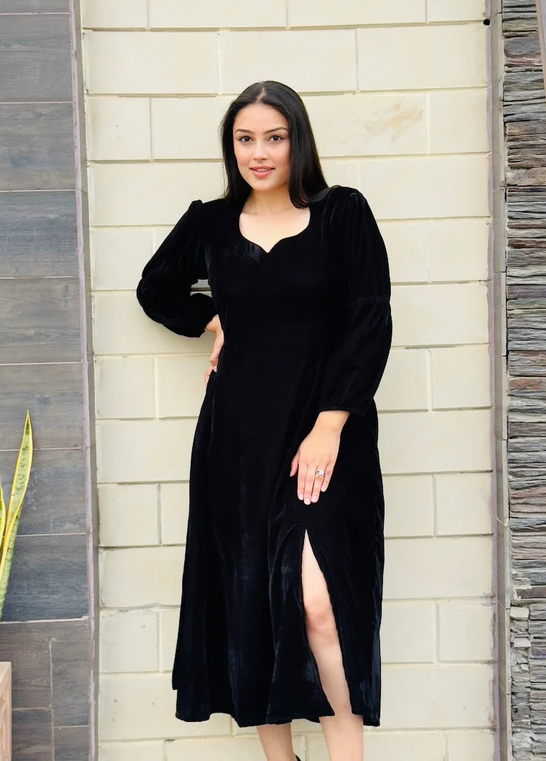 This black velvet dress features a flared cut and a flattering slit midi length, perfect for transitioning from day to night. With its professional neck design, this dress is suitable for both formal and casual meetings. Elevate your style and confidence with the Elle Velvet Dress.