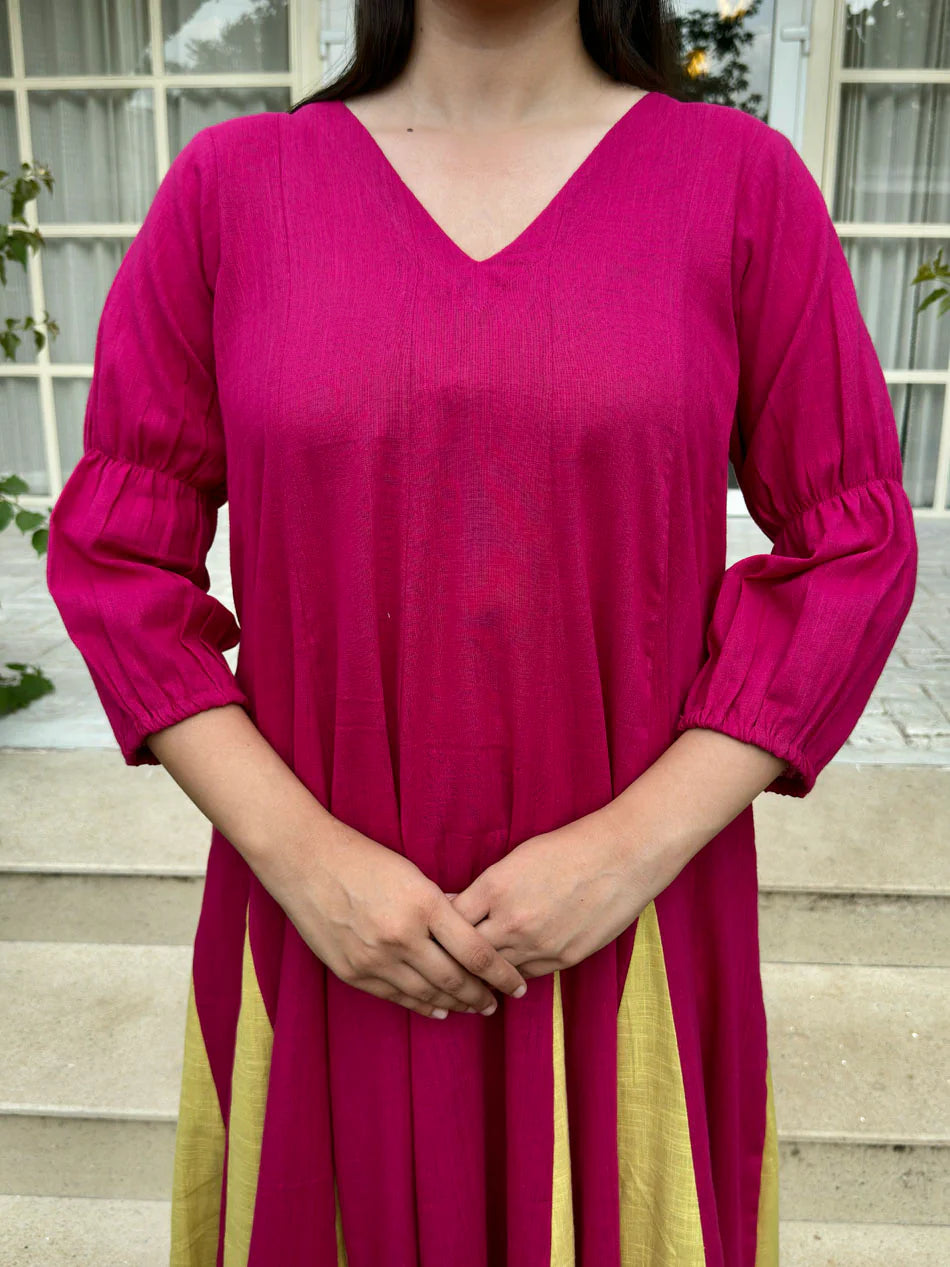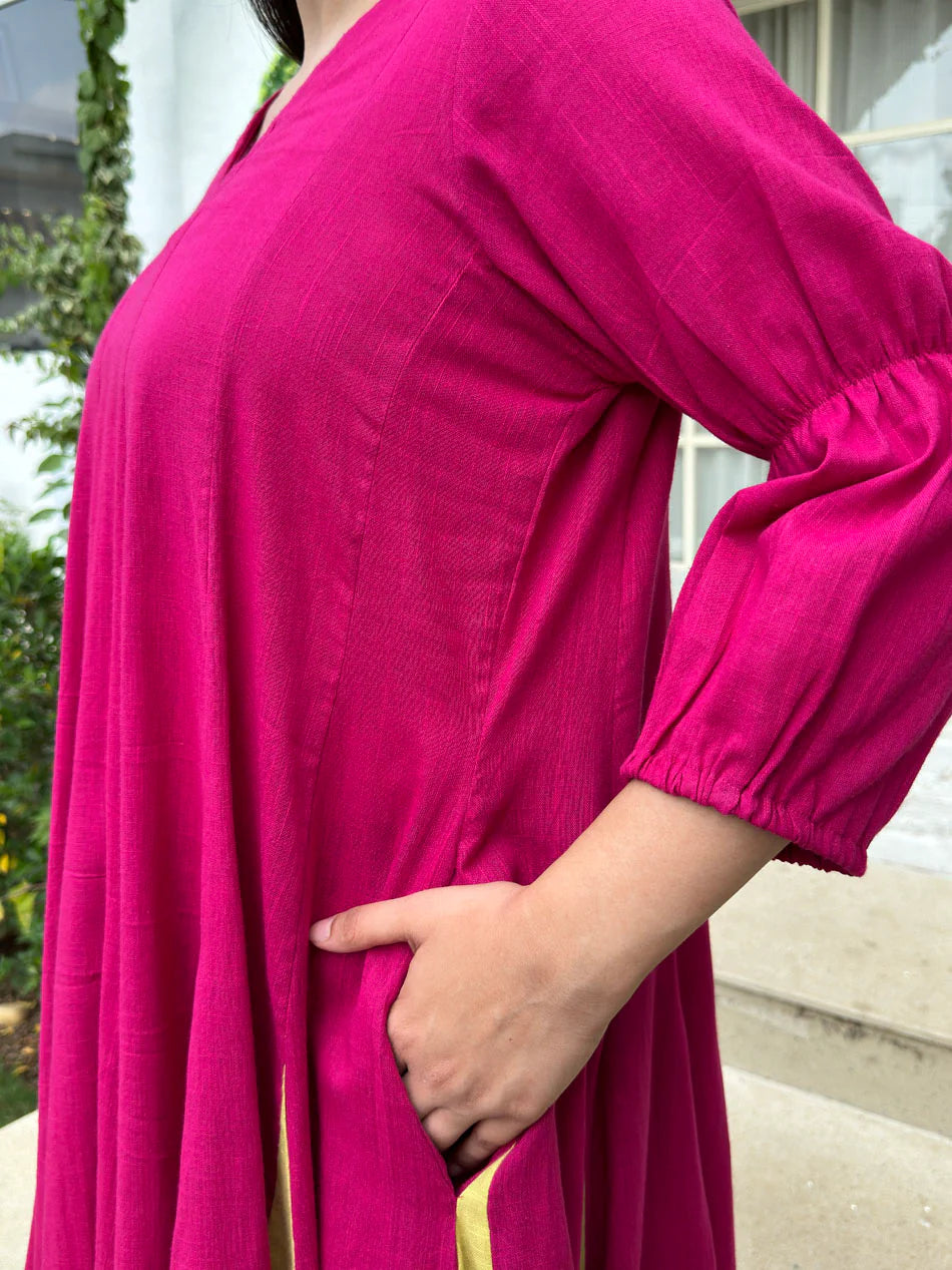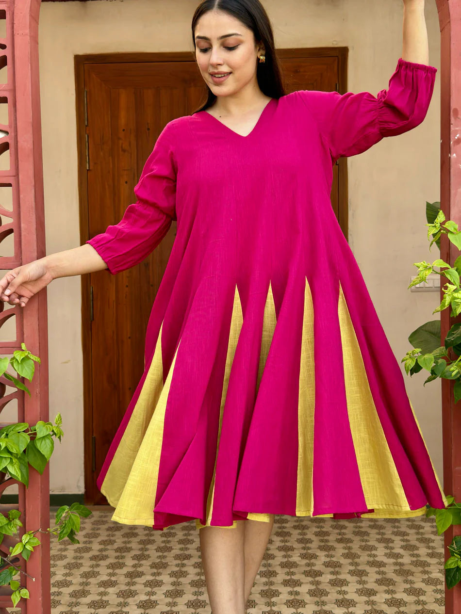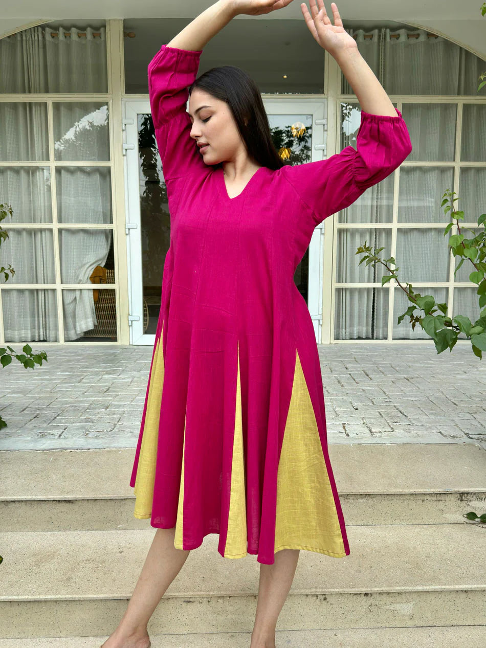 Flaunt your unique style in our Flora Flared Dress! Featuring a beautiful pink and yellow color combination, this midi dress by Tsyaa is crafted from 100 percent cotton with V-neck, delicate three fourth sleeves, a and waist flowing fall. Perfect for any occasion, dress it up or down with chic flats or heels. Experience ultimate convenience with pockets on both sides!