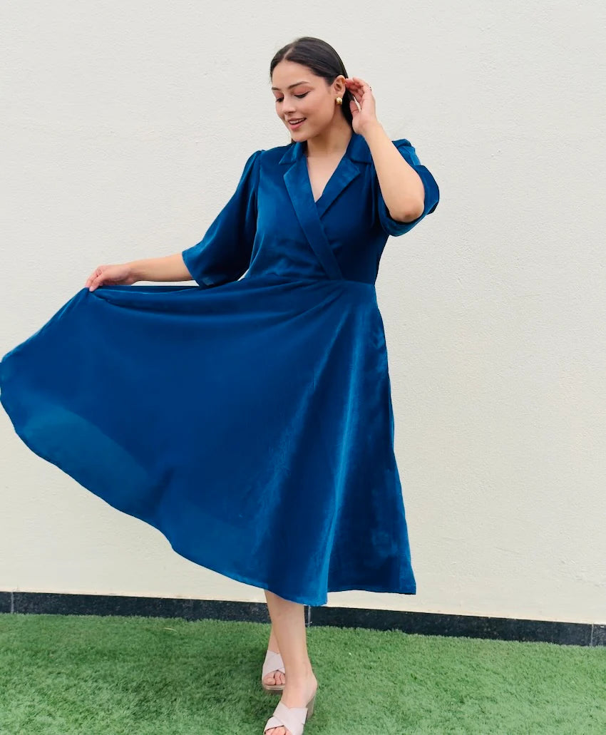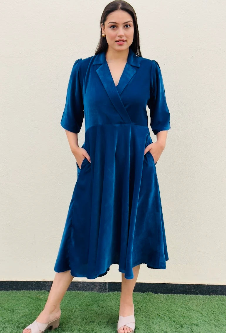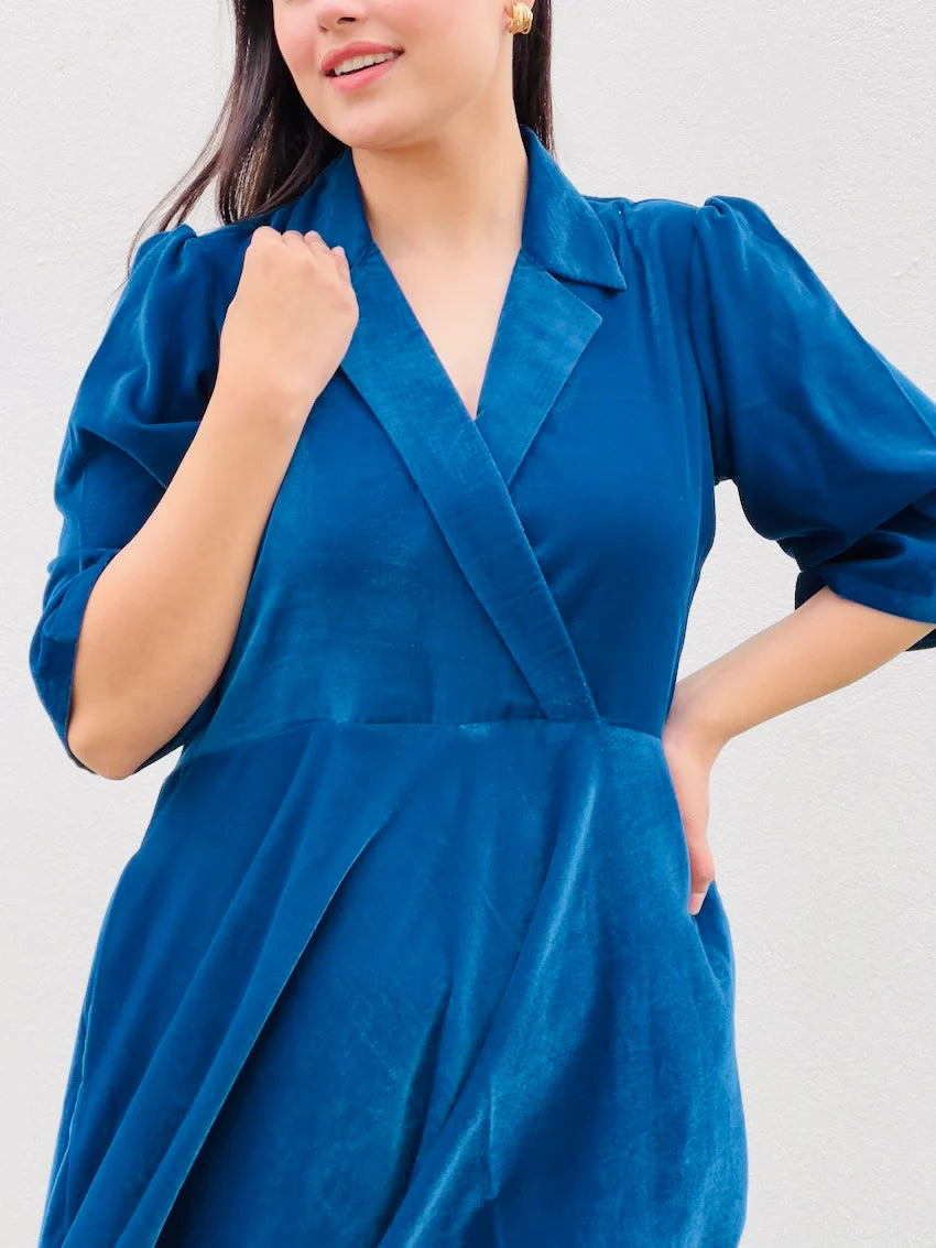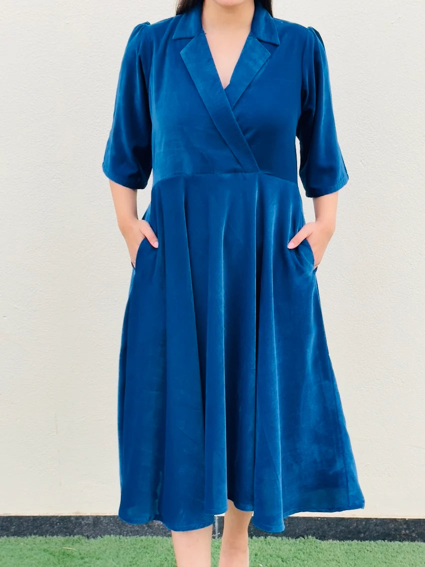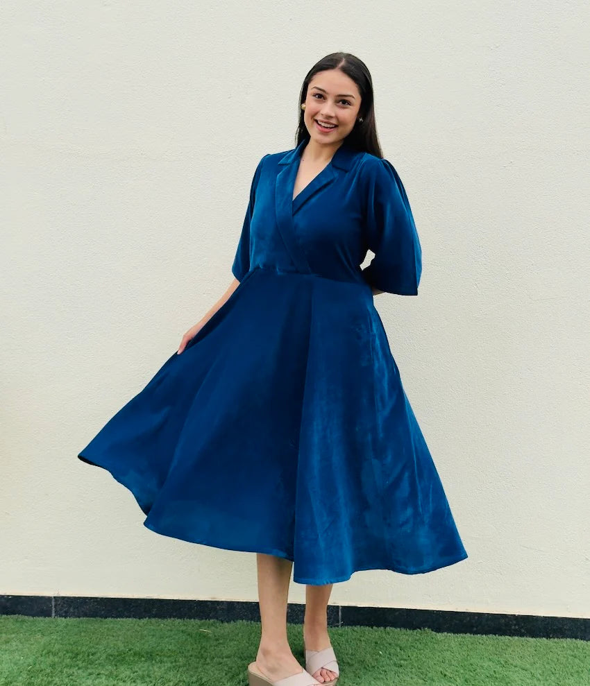 The Iris Velvet Dress is a chic and elegant addition to any wardrobe. The stunning blue color and unique angrkha neck design add a touch of sophistication, while the coat collar and flared fall of the velvet fabric create an aesthetic and eye-catching look. Make a stylish statement with this must-have dress.