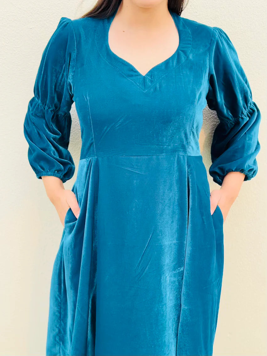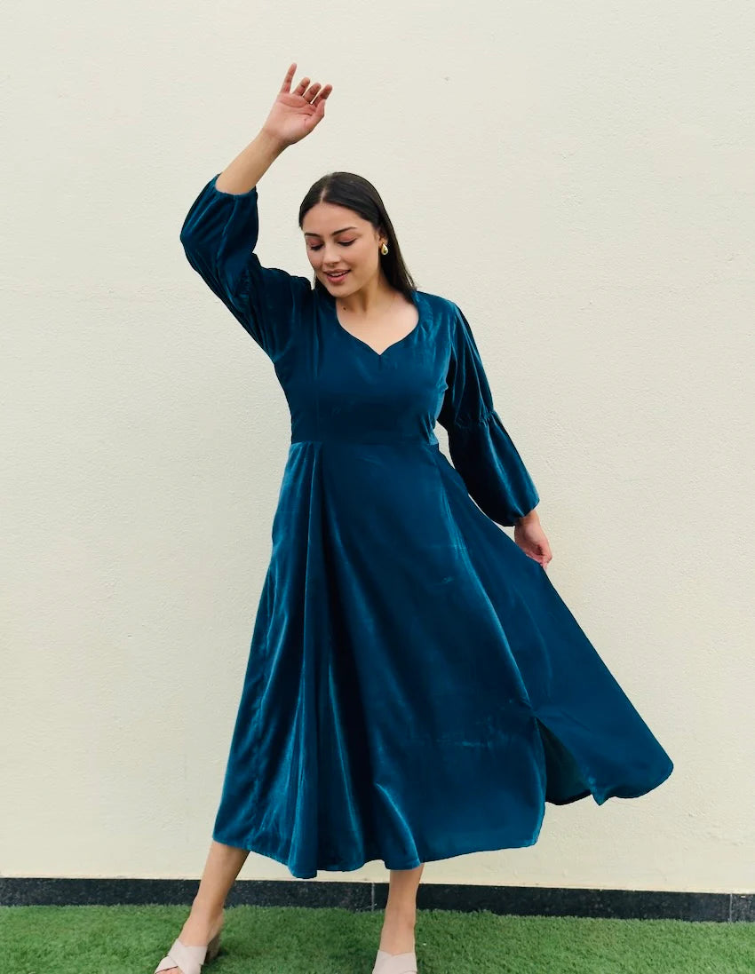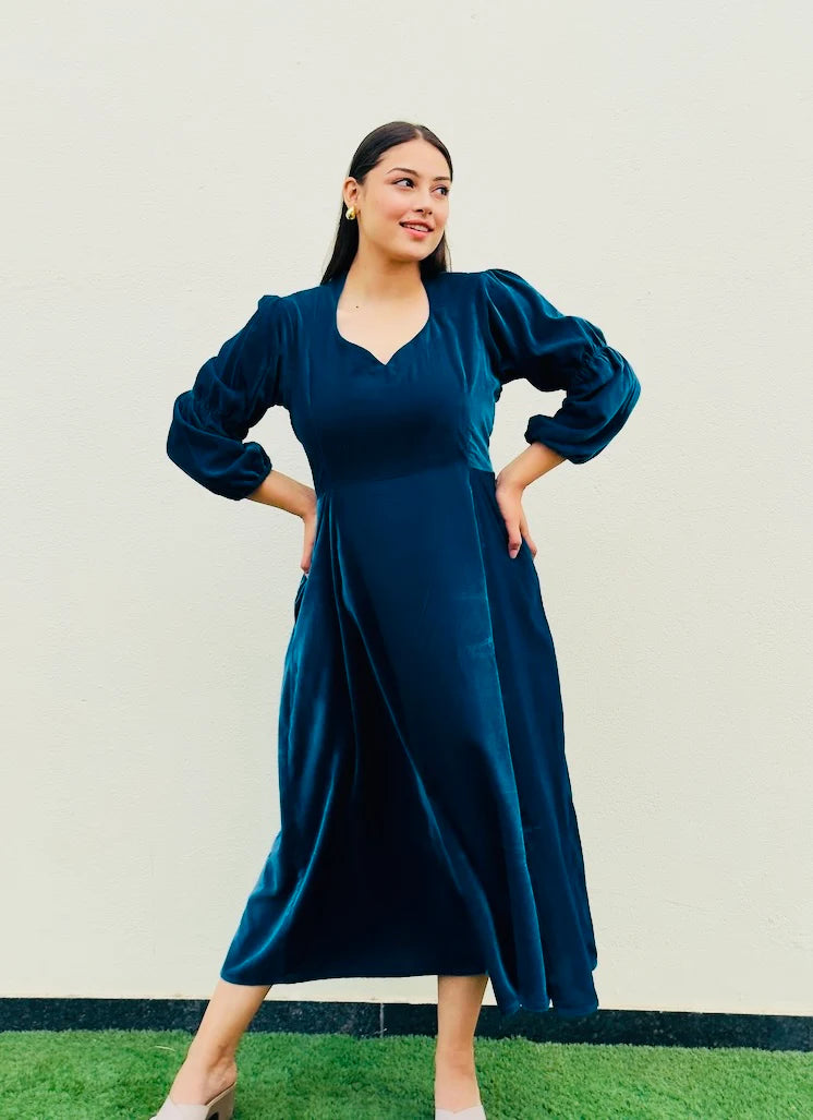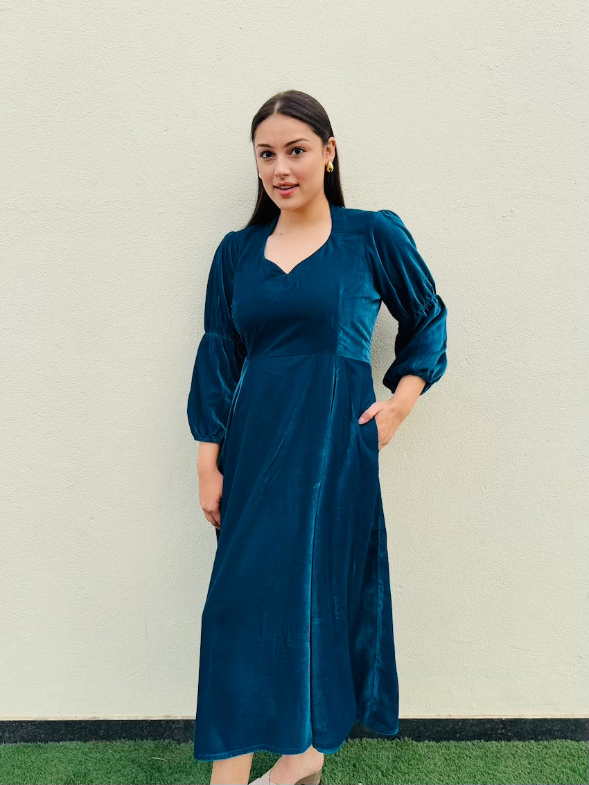 Get ready to turn heads in the stunning June Velvet Dress! This dress combines a rich blue velvet fabric and a heart-shaped neckline to showcase your elegance and highlight your collar bones. The long sleeves, front cut, and long length add a sophisticated touch while accentuating your curves. Elevate your style with this must-have dress!
