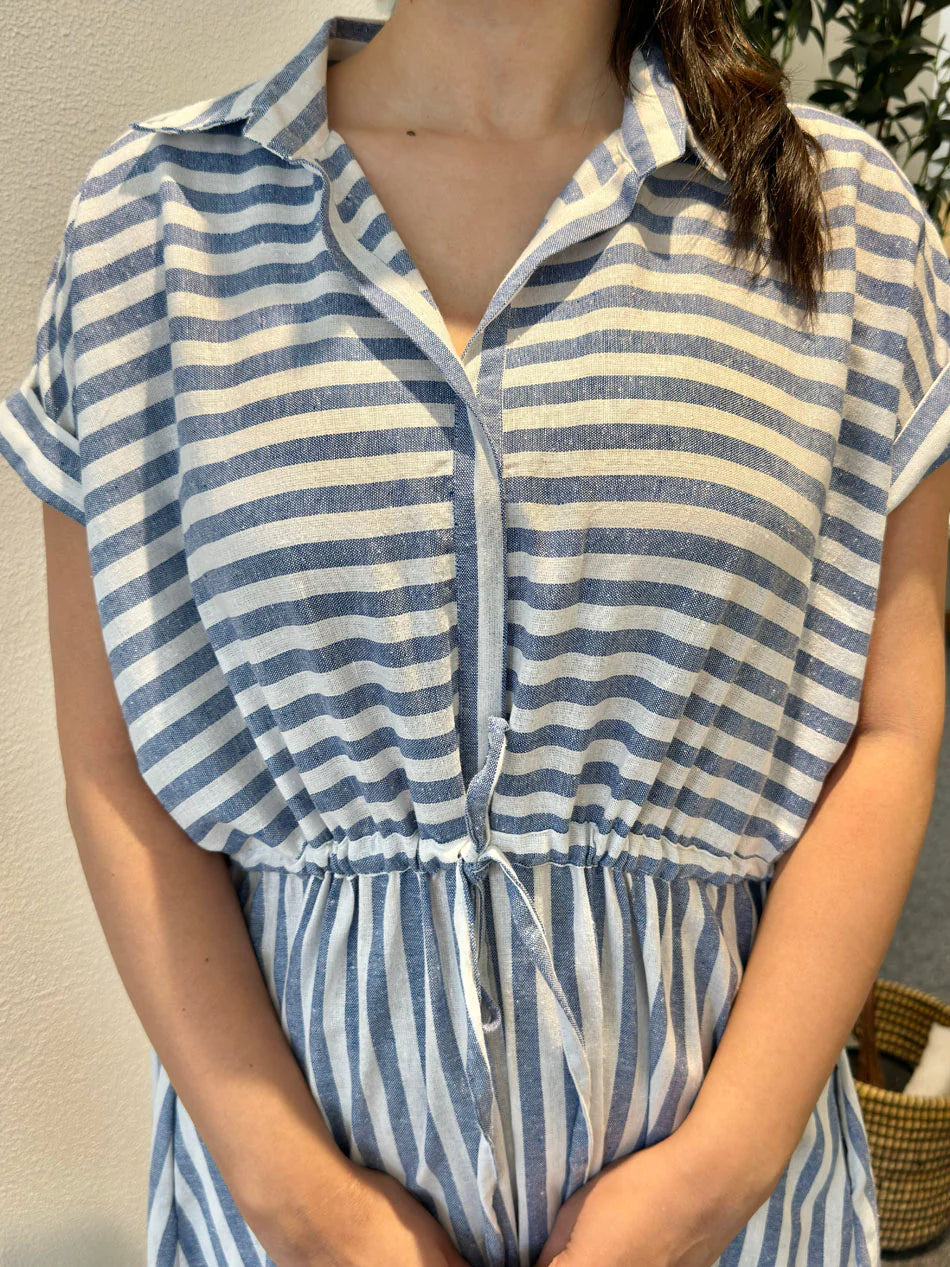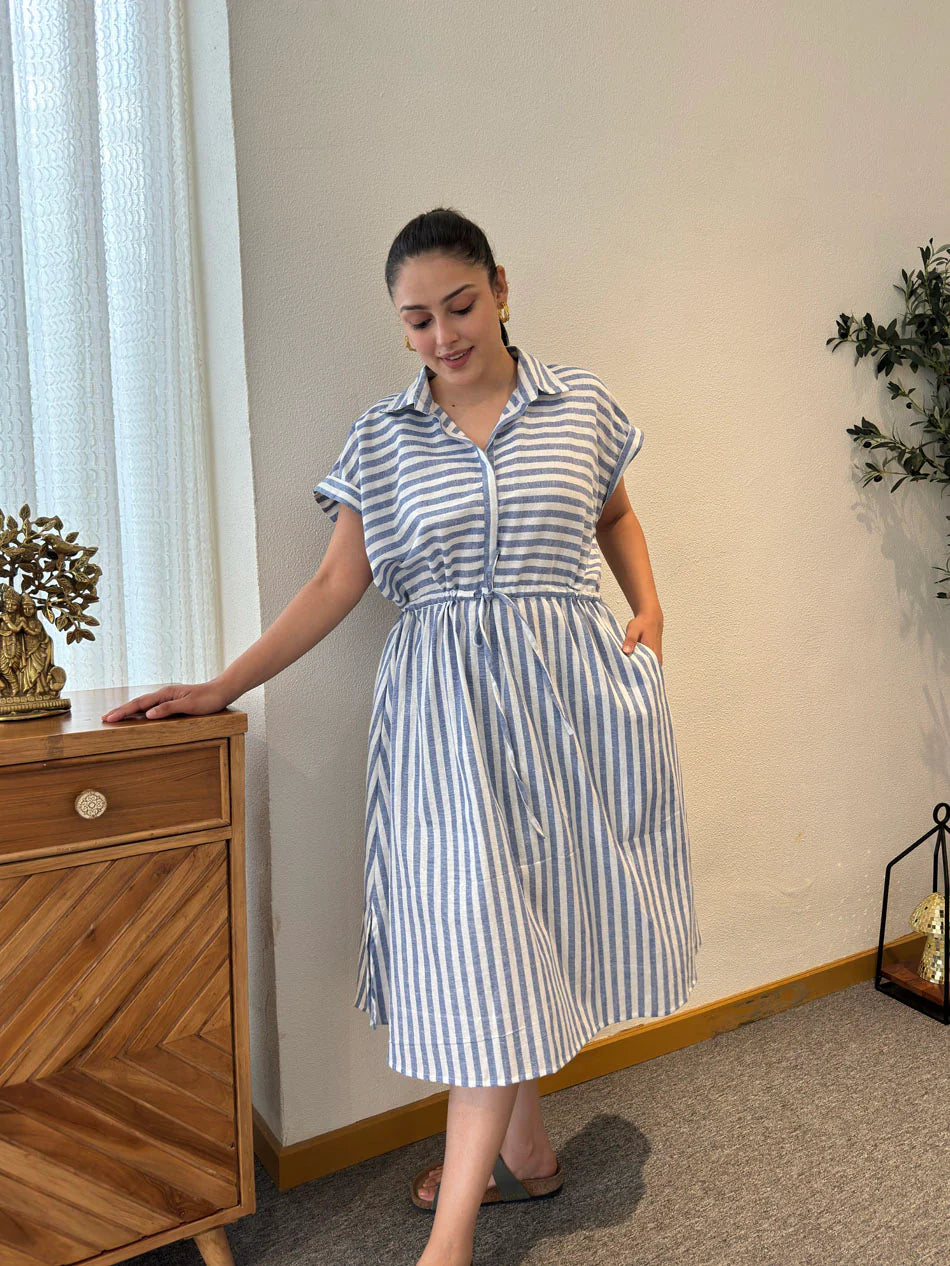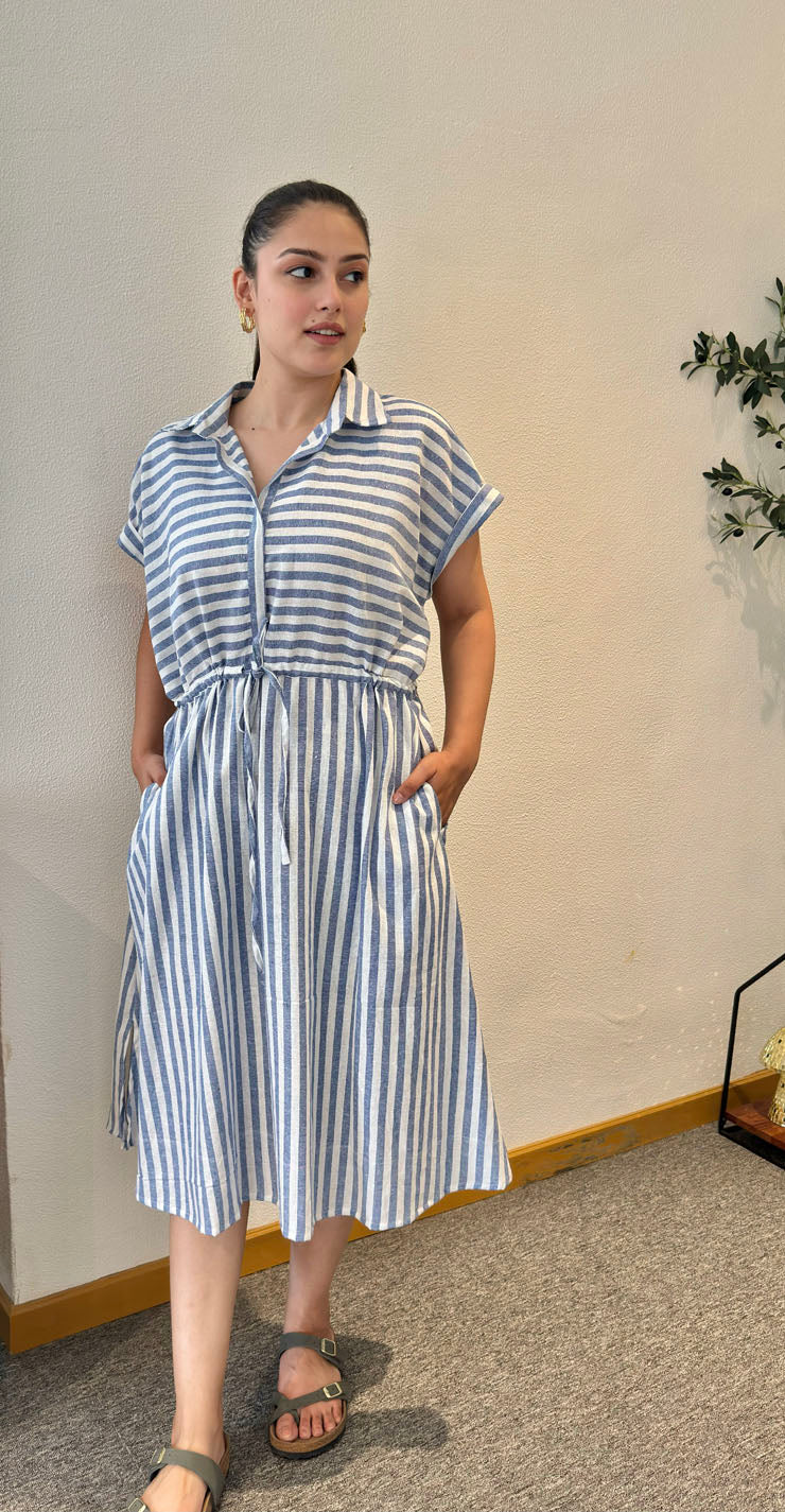 Elevate your style with the Paz Shirt Dress. Made from a breathable blend of Cotton mix fabric. This dress features a knee-length design and short sleeves. The double-layered yoke with gathers adds a touch of elegance, while the adjustable waist line creates a flattering silhouette. Perfect for any occasion, this dress will keep you comfortable and stylish all day long.