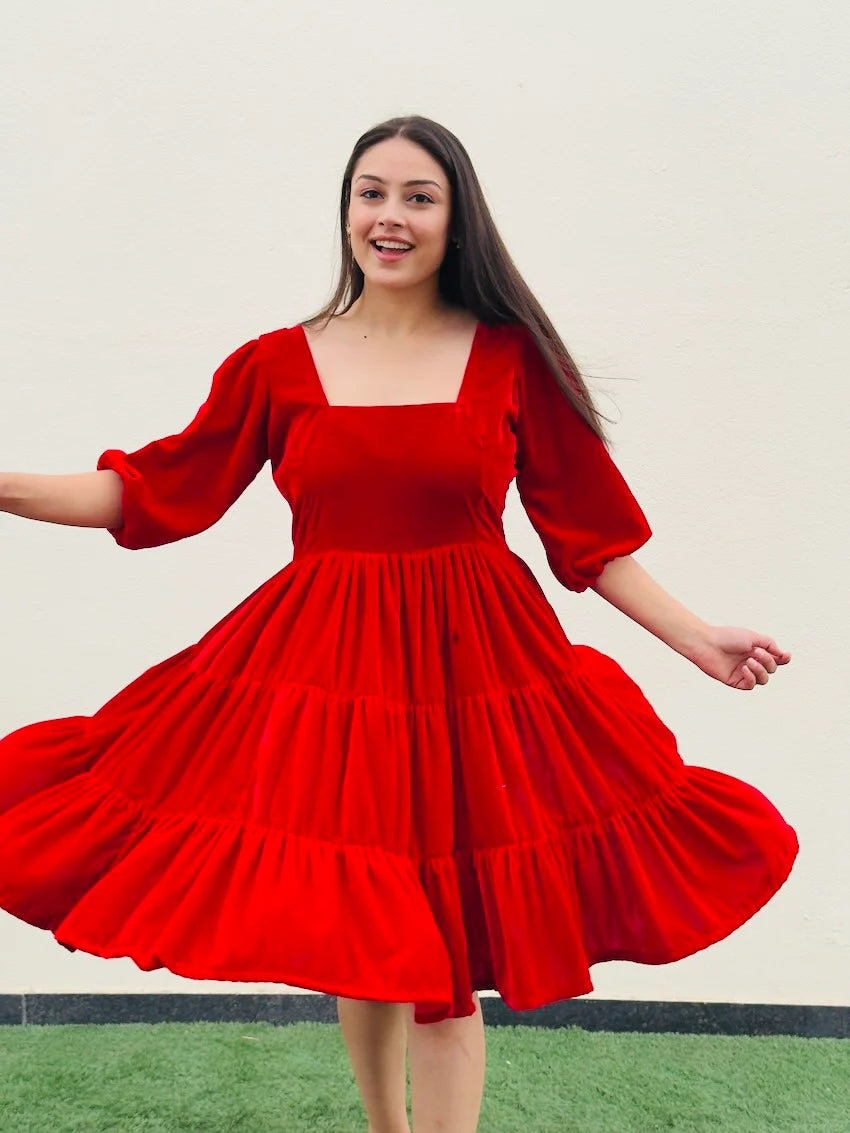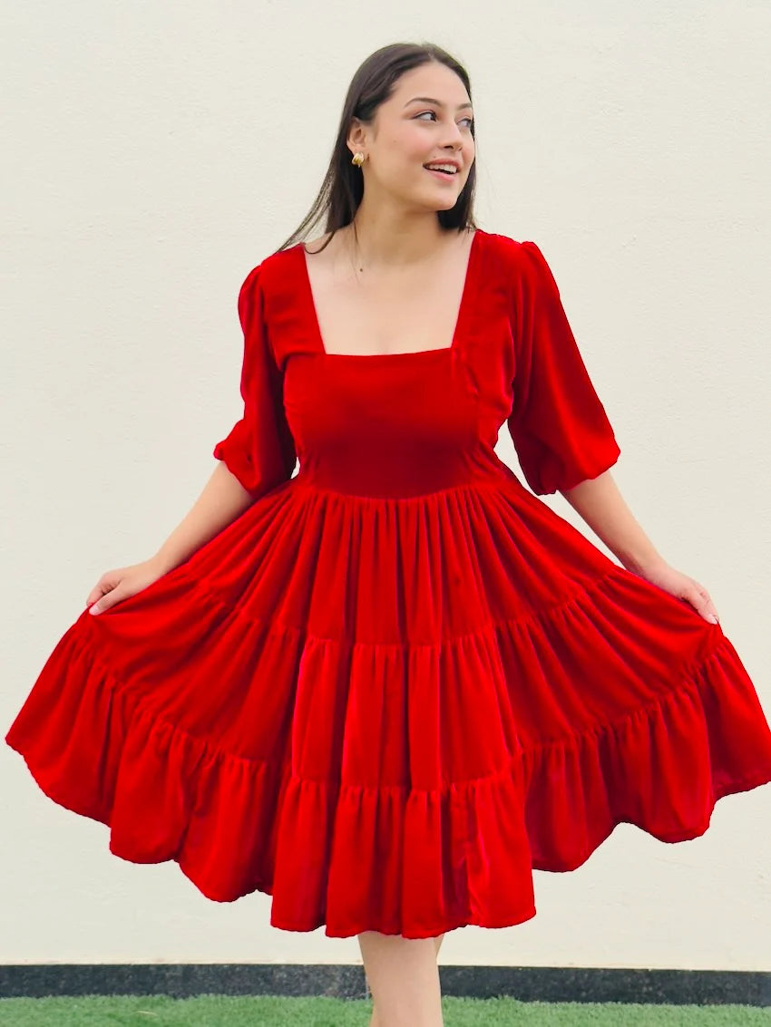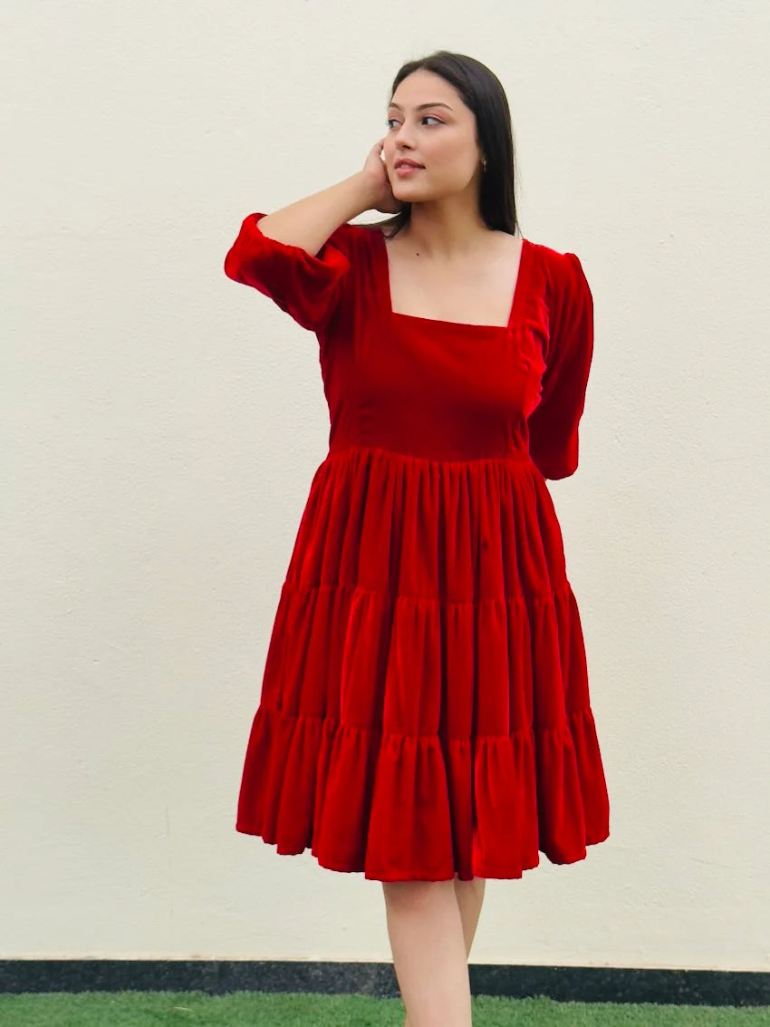 Elevate your evening ensemble with our Riva Velvet Dress! The luxurious velvet fabric adds a touch of elegance while the three tier flared style creates a flattering silhouette. With a knee length fit and loose sleeves, this party dress is both chic and stylish. Show off your shoulders with its square neck design.