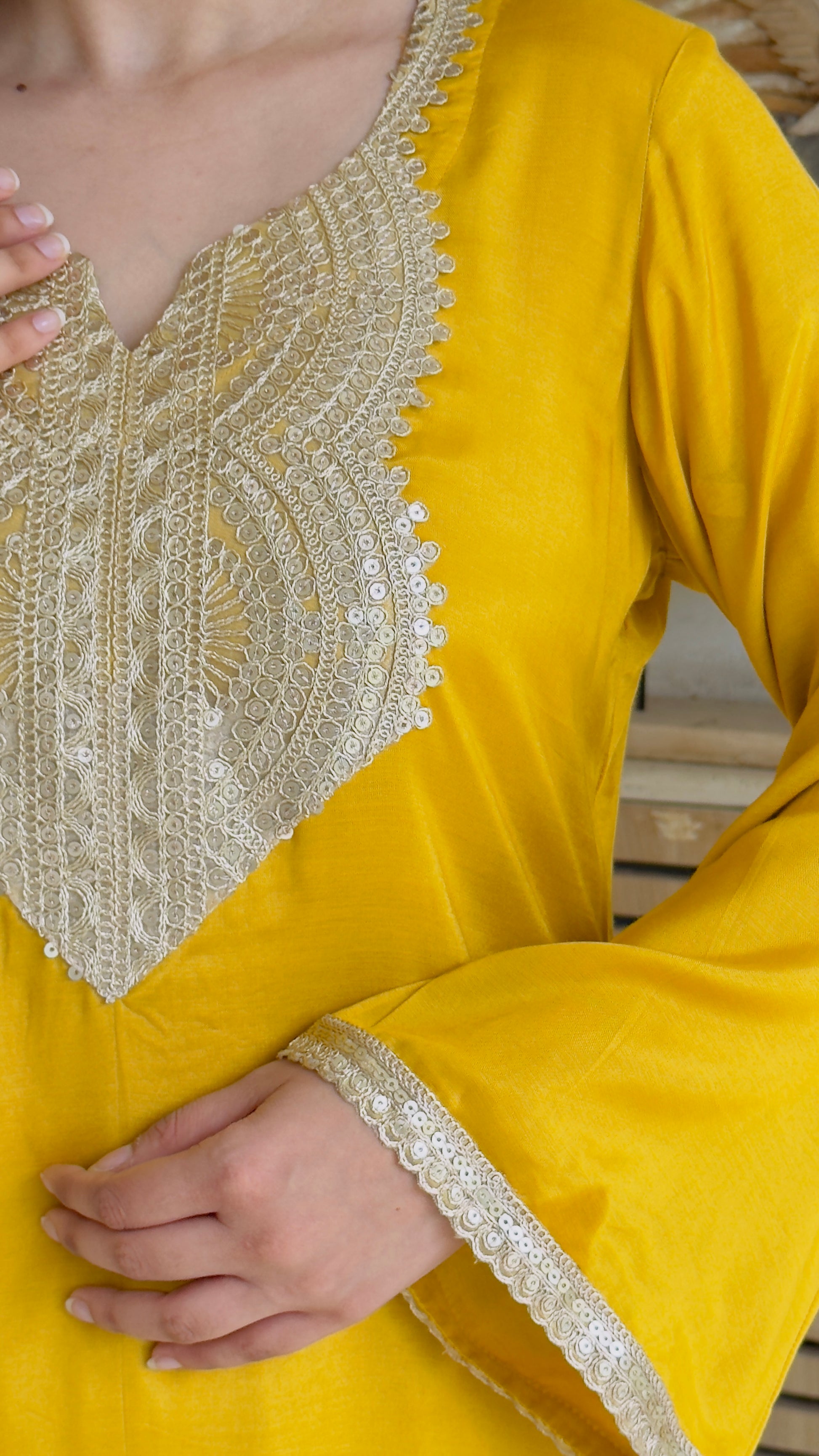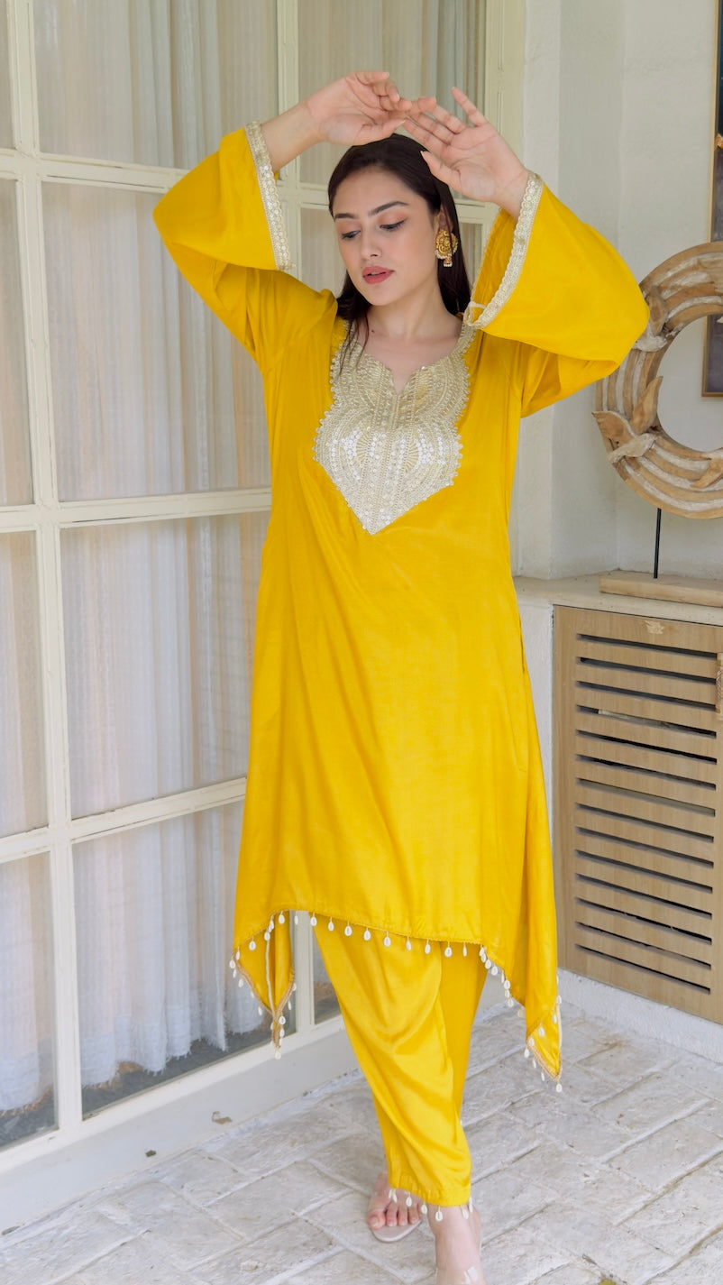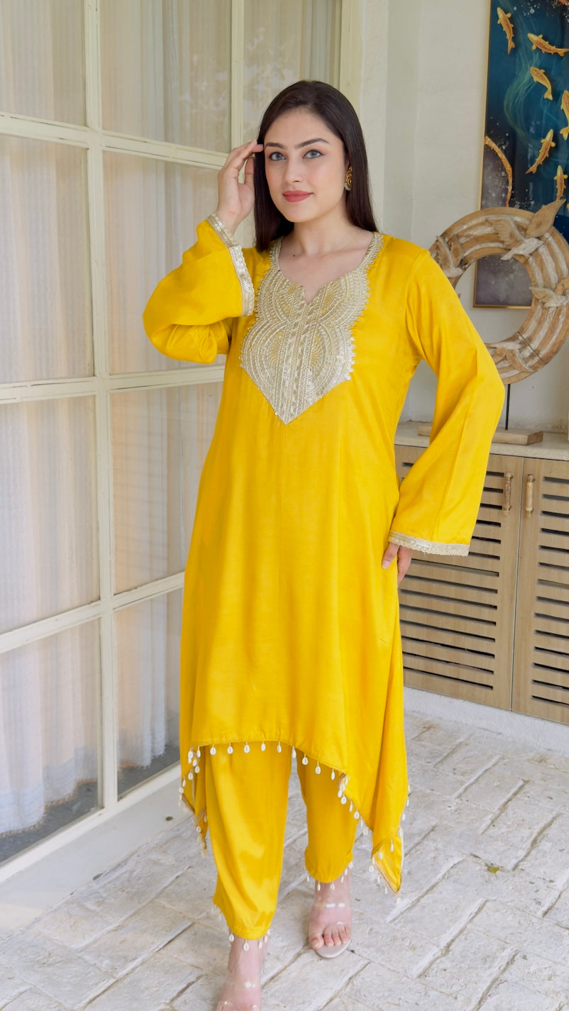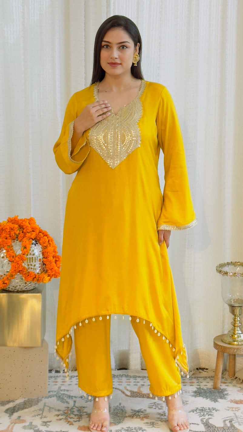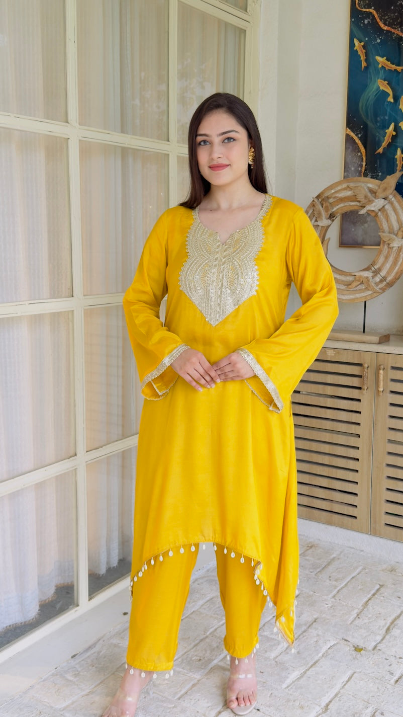 The Ruhi Kurta Pant in mustard yellow offers a refined ethnic look perfect for wedding celebrations and festive occasions. Its vibrant hue and elegant design combine tradition with contemporary style, making it a chic choice for those seeking both comfort and sophistication this season. Dry Clean or Hand Wash with Mild Detergent.