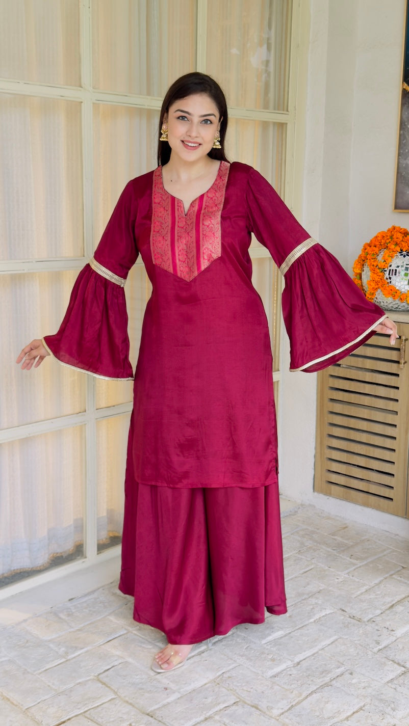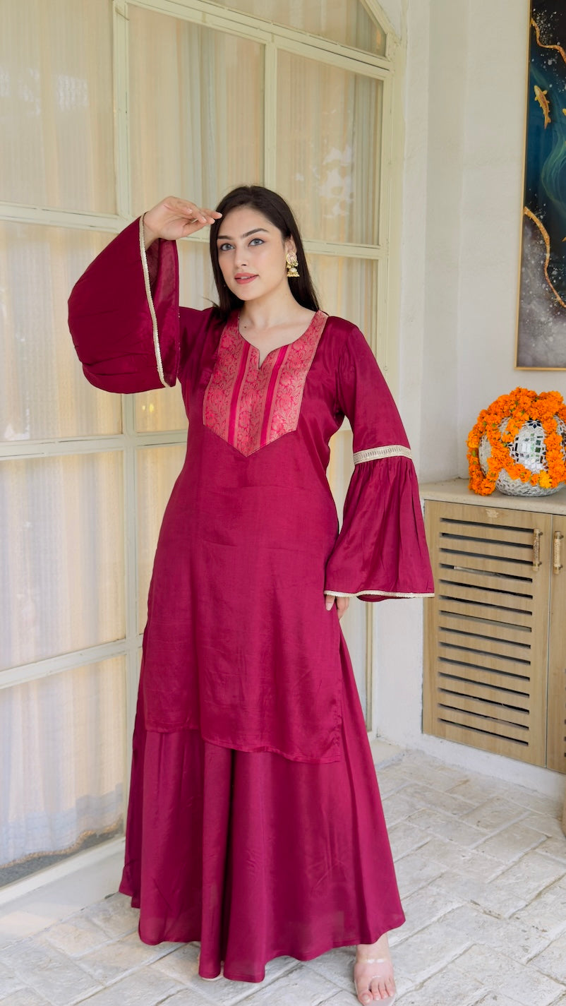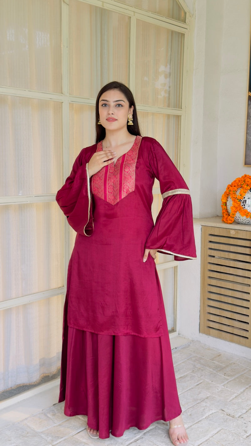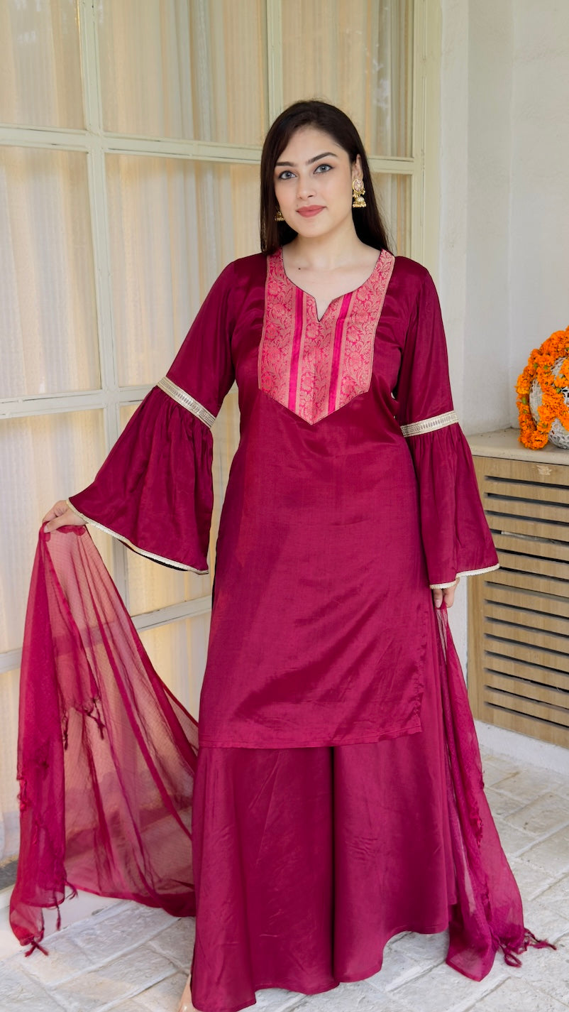 This three-piece Shama Sharara Suit Set features a bell-sleeve kurta adorned with intricate ethnic lace patchwork, combining traditional craftsmanship with modern elegance. The stylish sharara offers both comfort and a chic silhouette, making it an ideal choice for festive occasions. Designed for women who appreciate outstanding ethnic wear, this set blends sophistication with ease, perfect for celebrating cultural events in style. Dry Clean or Hand Wash with Mild Detergent.