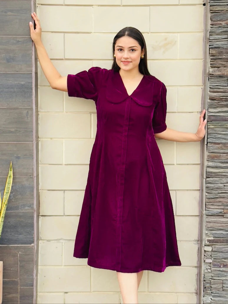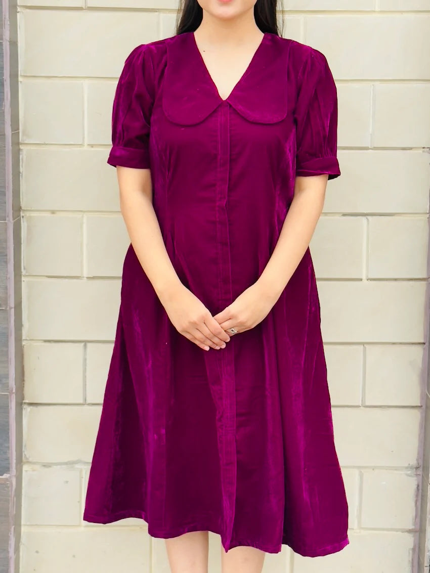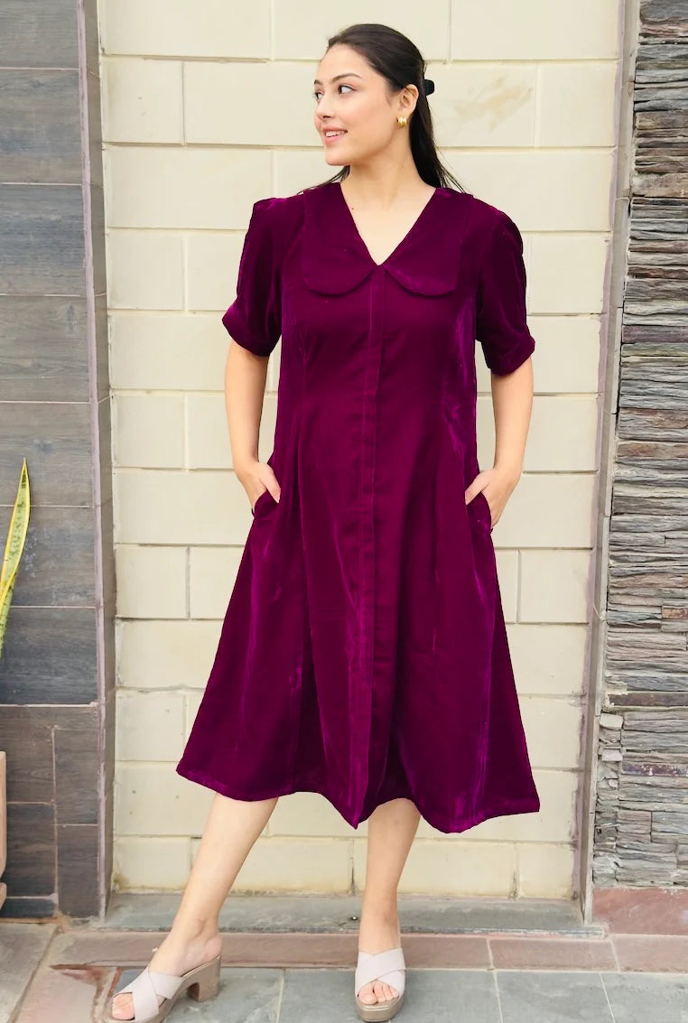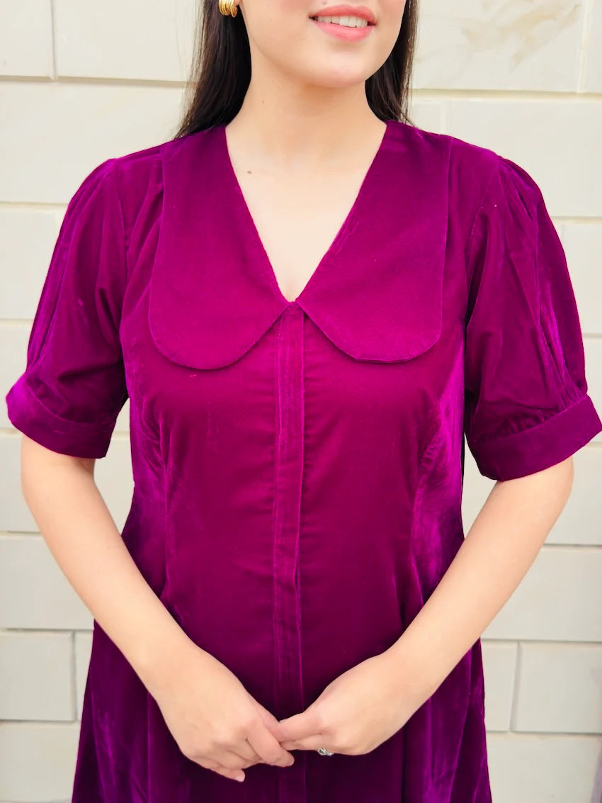 Elevate your style with the Vela Velvet Dress! Crafted in a rich wine hue and featuring a baby collar design, this dress exudes elegance. The front slit and A-line silhouette offer comfort and a flattering fit, while the plush velvet fabric adds a touch of luxury. Make a statement with this utterly flawless piece.