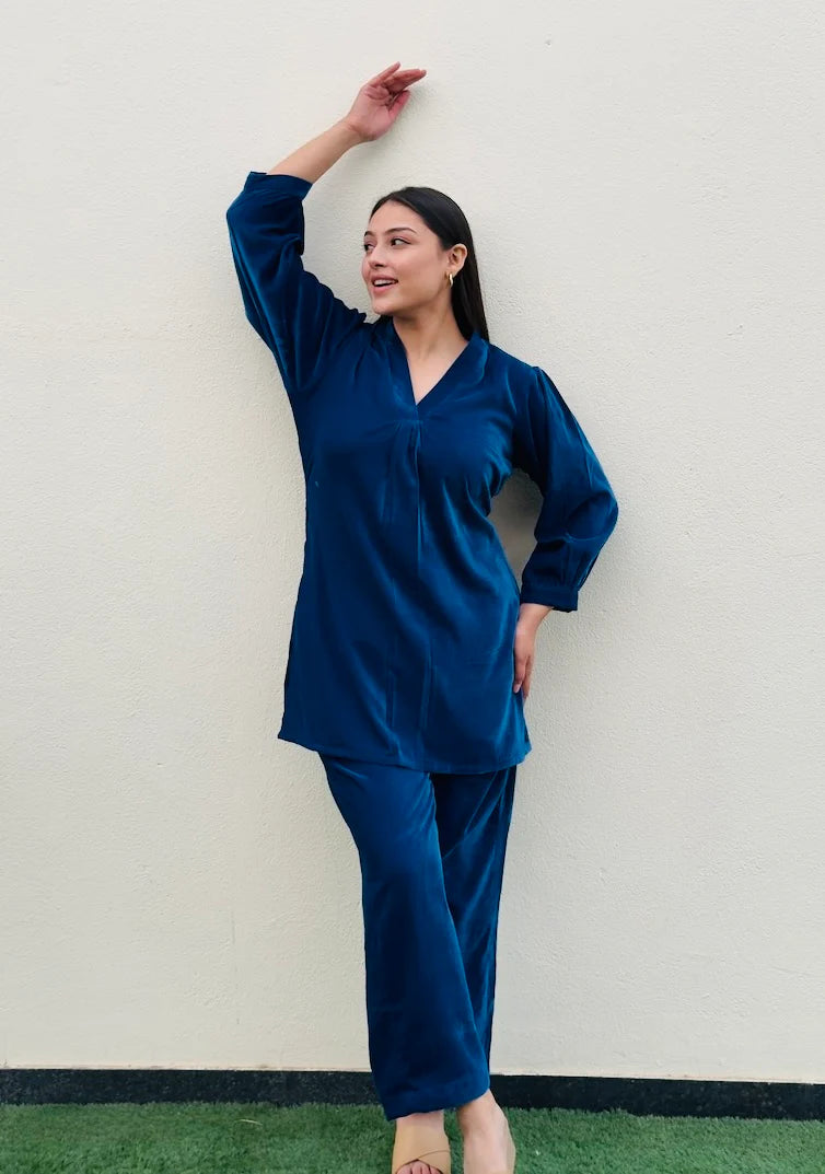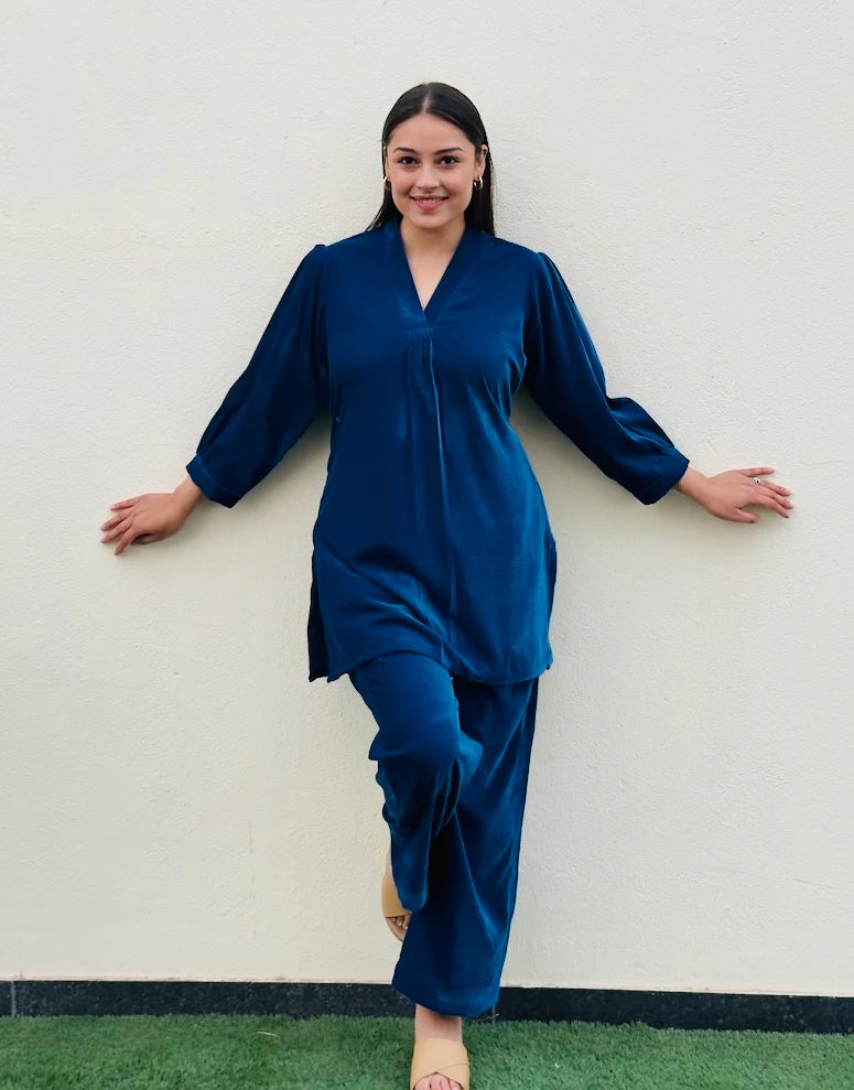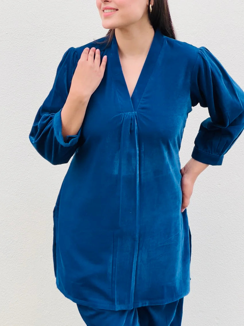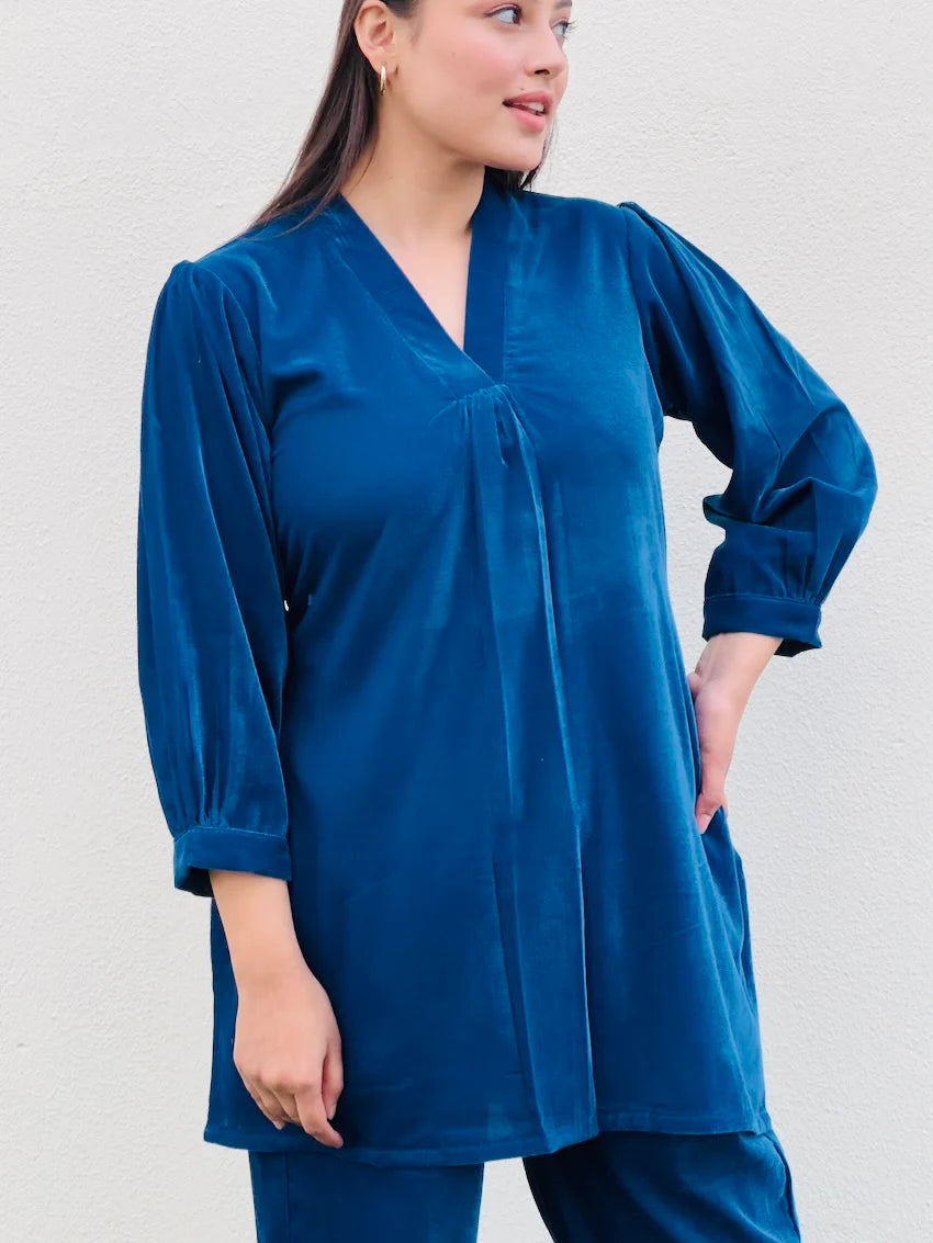 Elevate your style with the Verra Velvet Coordset! This stunning set features a v-neck front gather and long sleeves for a sophisticated yet comfortable look. Perfect for any occasion, from work to social gatherings or just lounging at home. Experience the luxurious feel of blue velvet while looking effortlessly stylish.